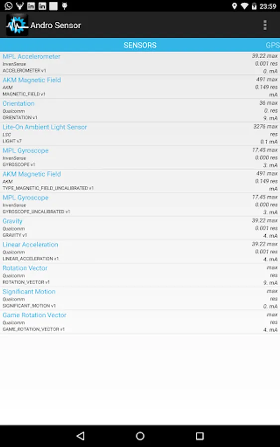 View in a single screen the data from all device's sensors in real time. Graphical and text output available for each sensor (graphs are not available for proximity, location and battery info).