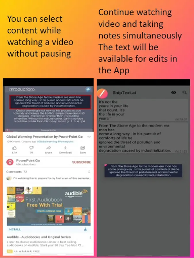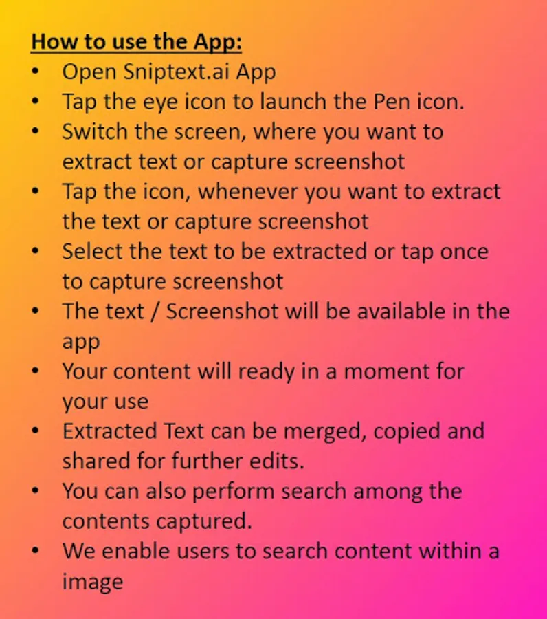 - Students listening to video lectures and reading documents in mobile: Our app enables them to extract content while studying without any distraction and provides them the snip in an editable format. They can make their notes in the desired way.