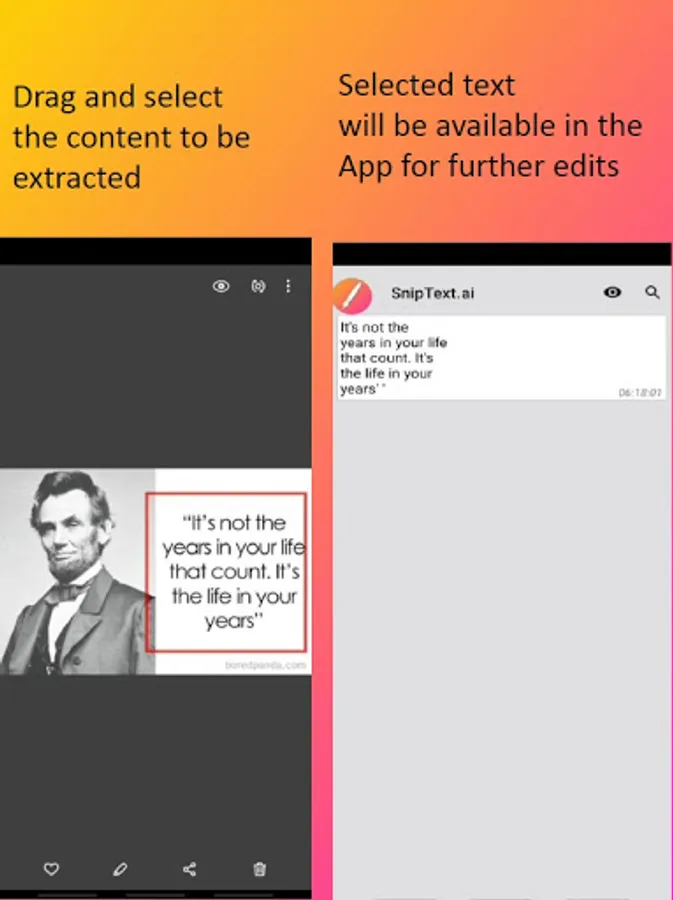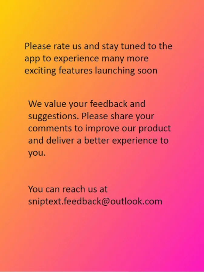 SnipText is an intelligent content extractor and note making app. Our aim is to enable you to make notes efficiently while using your mobile phone. Our app enables you to extract text seamlessly from the mobile screen irrespective of which app you are in and convert them into useful notes which you can view, edit and share. Our app is particularly useful to extract selective content from streaming videos, images, documents, PDFs and in short - anywhere from the screen. Our app also lets you to capture screenshots with single touch and more importantly search within the captured screenshot images. We believe it will help the people listening to online lectures immensely for making notes for future reference. User can note important points without pausing the video which saves time and prevents distraction while listening or reading.