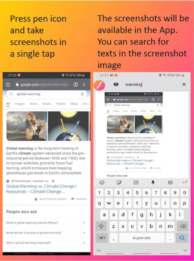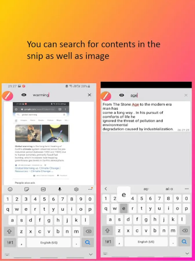 - Travelers: Our app help users to search content within the text heavy image. Users can click multiple images on the go. All these images can be captured as screenshots in the app and the content can be searched for seamlessly.