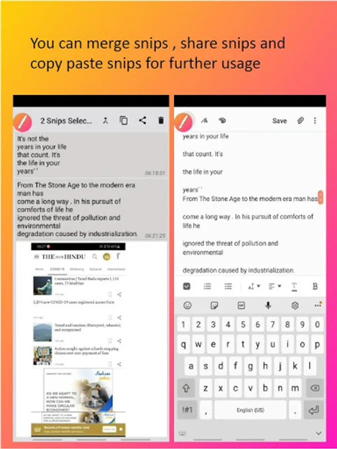 - Aspirants preparing for the competitive exams: Our mobile app helps them to extract text from multiple source and merge into a single snip. It can help them in making comprehensive notes for their perusal.