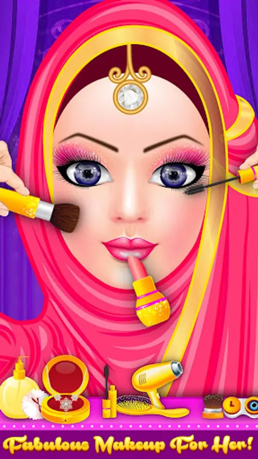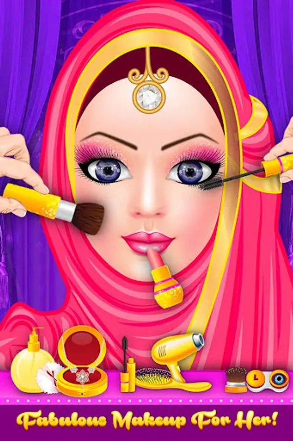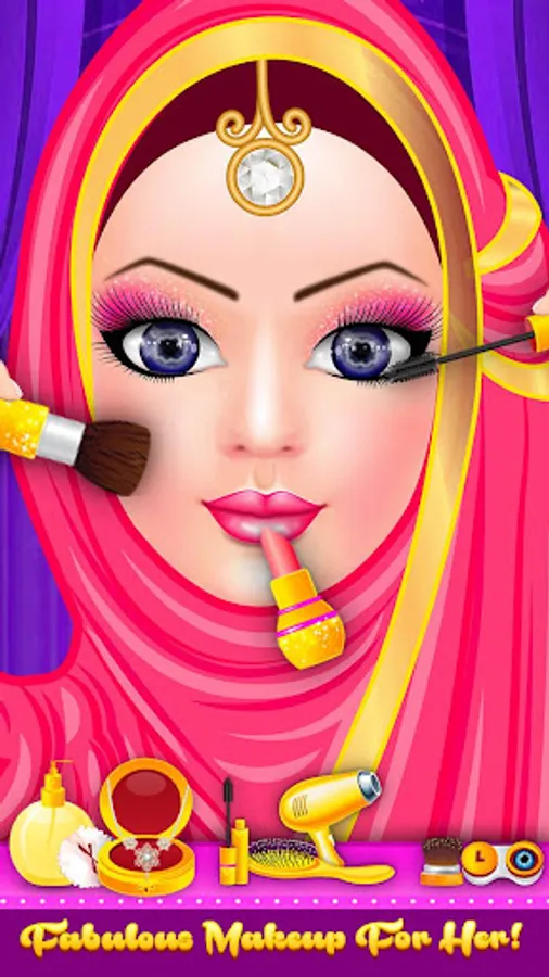 Start your Hijab Fashion Doll beauty salon with royal make up; choose princess style hairstyle, perfect eye makeup, hot lipstick & lots of fashion accessories; give your Hijab Fashion Doll celebrity look with latest royal muslim designer dresses.