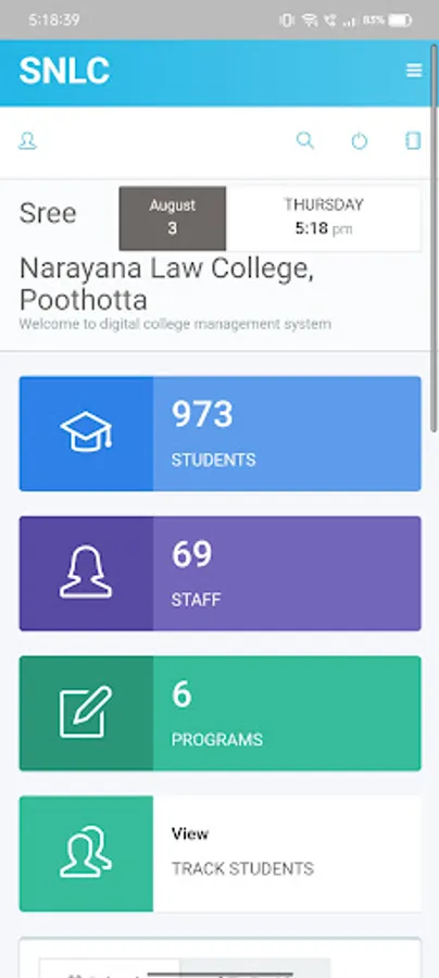 Mobile app for staffs of Sree Narayana Law College Poothotta. Sree Narayana Law College is one of the constituent units of Mahathma Gandhi University,Kottayam and recognized by the Bar Council of India,New Delhi. The affiliation is approved by the Bar Council of India through its letter NoBCI:D:2003/2012(LE.Affi.) dtd 29.09.2012.