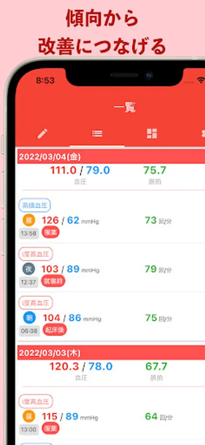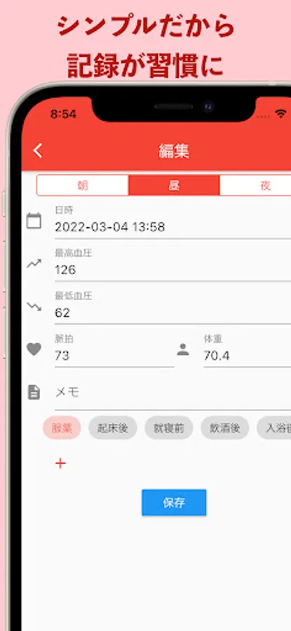 ・You can also record the measurement time, and you can know the trend of blood pressure for each situation.