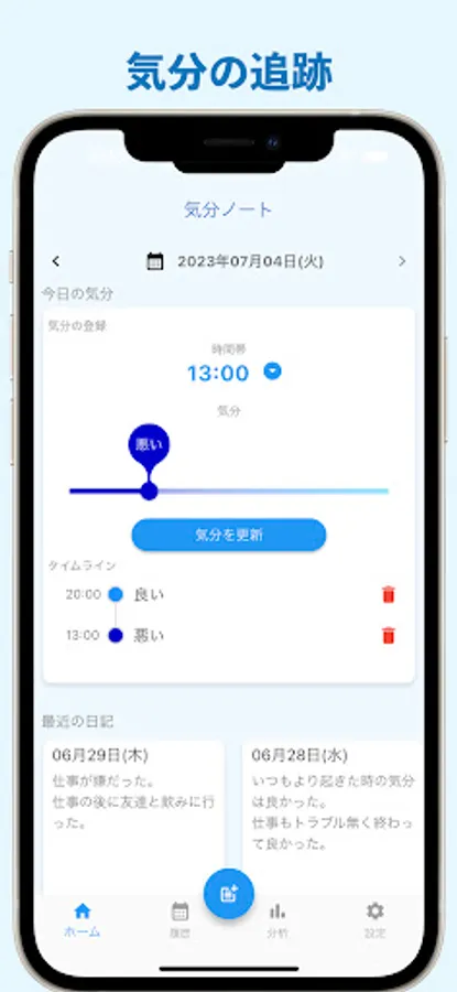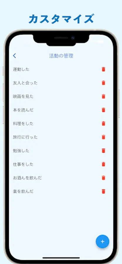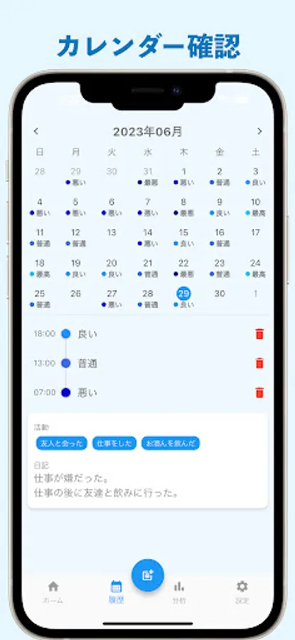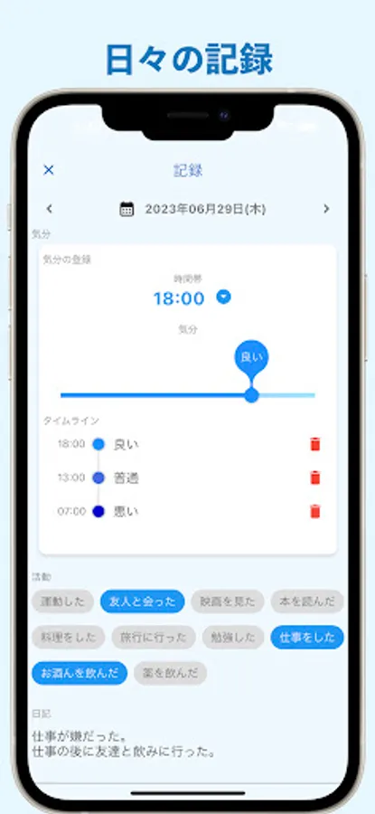 ・Mood recording: You can easily record your mood fluctuations throughout the day. It is also possible to evaluate the mood in 5 stages and record it for each time period.