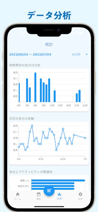 ・Statistics and analysis: Based on the recorded data, visually analyze mood fluctuations and the relationship between activity and mood.