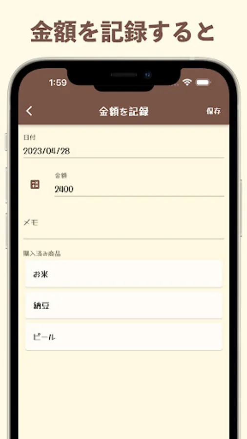 When you select a date on the calendar, the items you bought on that day are displayed and can be edited.