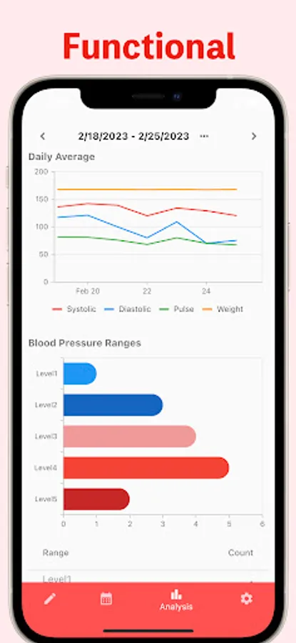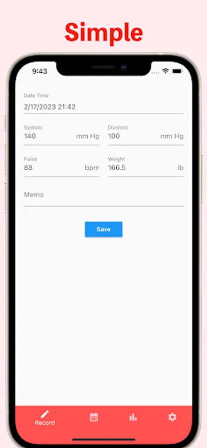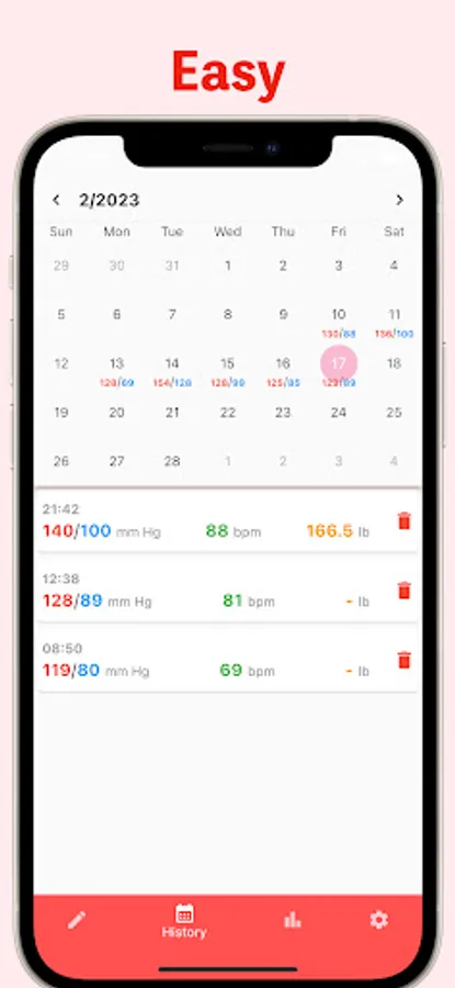You can check the recorded blood pressure on the calendar. Select a calendar date to see a list of records for that day. If you measure multiple times on the same day, the average value will be displayed on the calendar.