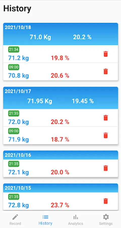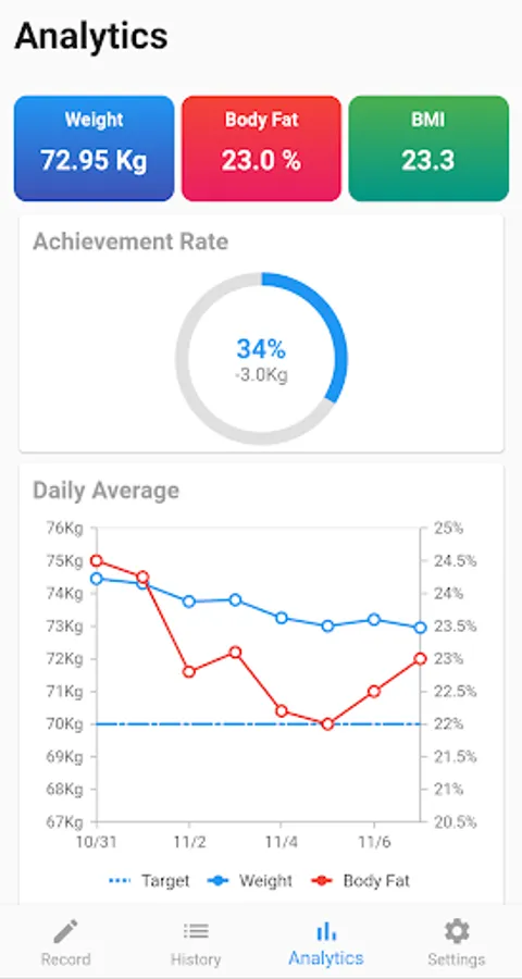 The recorded weight and body fat percentage are displayed in a list and graph.