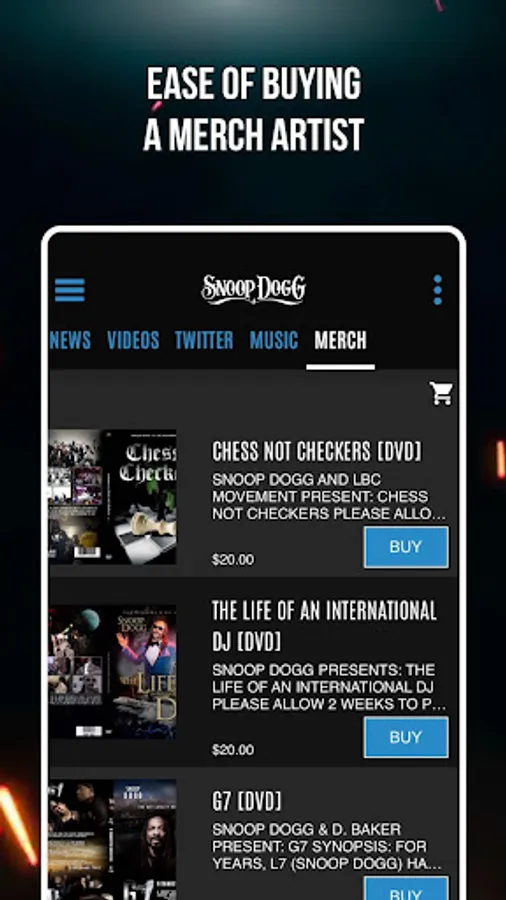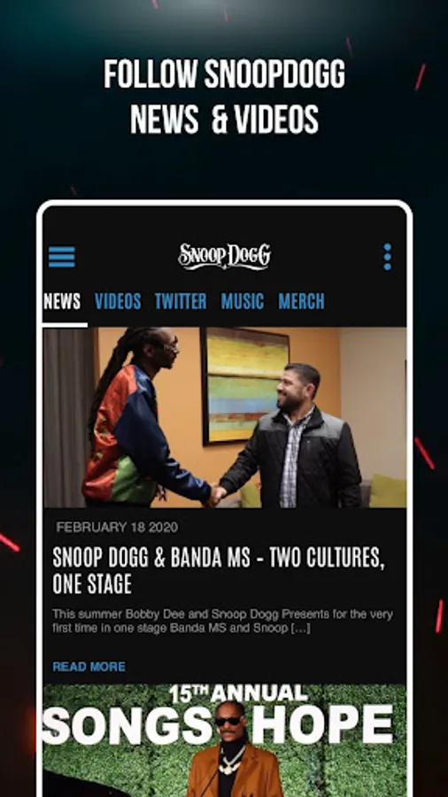 Snoop Dogg's official fan app is here! Download today to get all of Snoop's content together in one place, and be the first to get access to exclusive offers and news from Snoop. Fo' shizzle.
