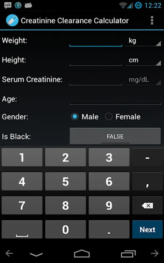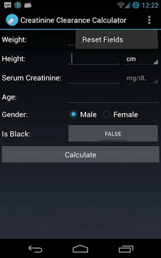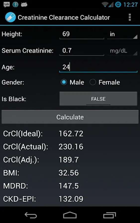This app calculates creatinine clearance in 3 different ways to easily compare the results. The first equation uses the Cockcroft-Gault equation and displays the results for Actual Body Weight, Ideal Body Weight (IBW calculated via the Devine formula) and Adjusted Body Weight. The calculated BMI (Body Mass Index) is also displayed to assist in selecting the appropriate result, as the result based on the IBW may be more accurate in obese patients. The second result is based on the 4-variable MDRD (Modification of Diet in Renal Disease) formula which is validated in patients with Chronic Kidney Disease. The final result is based on the CKD-EPI (Chronic Kidney Disease Epidemiology Collaboration) formula which may be more accurate than the MDRD equation.