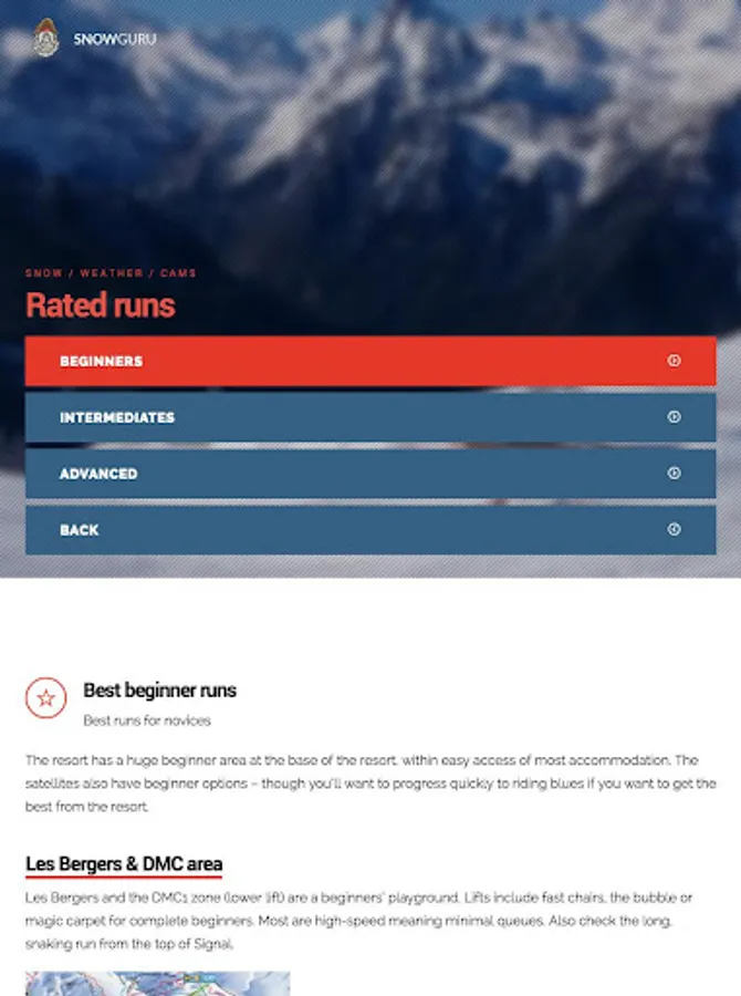 - Recommended runs split by ability – beginner, intermediate, advanced