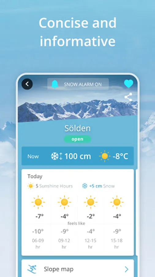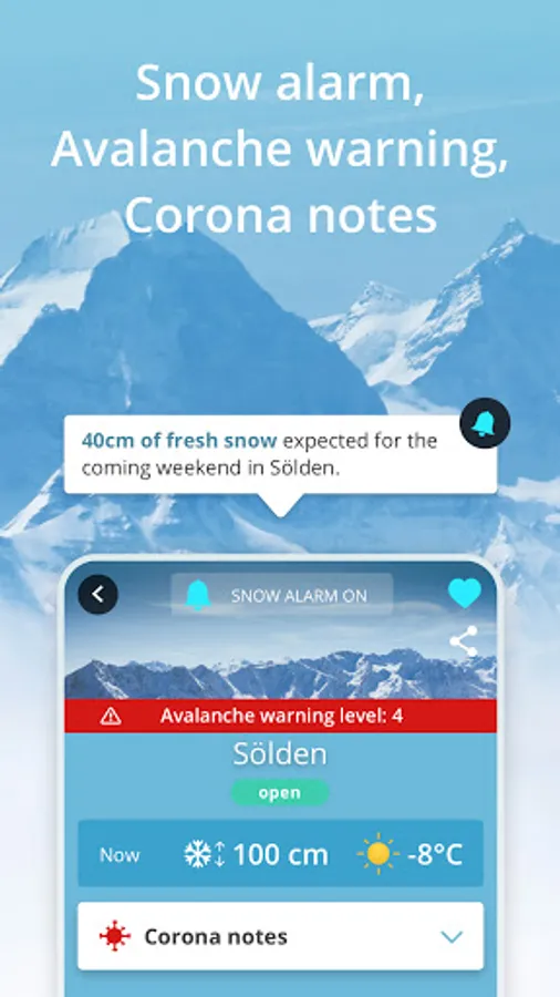 Check your nearest skiing area and local conditions at a glance – and view the current weather, snow quality and state of the slopes, quickly and easily. View the current weather, snow quality and state of the slopes, quickly and easily.