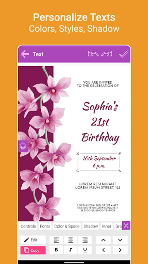 7. Wish them with your own text, you can change font style, color, size, gradient, shadow, stroke.