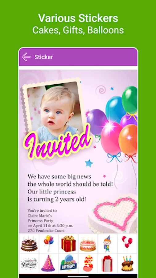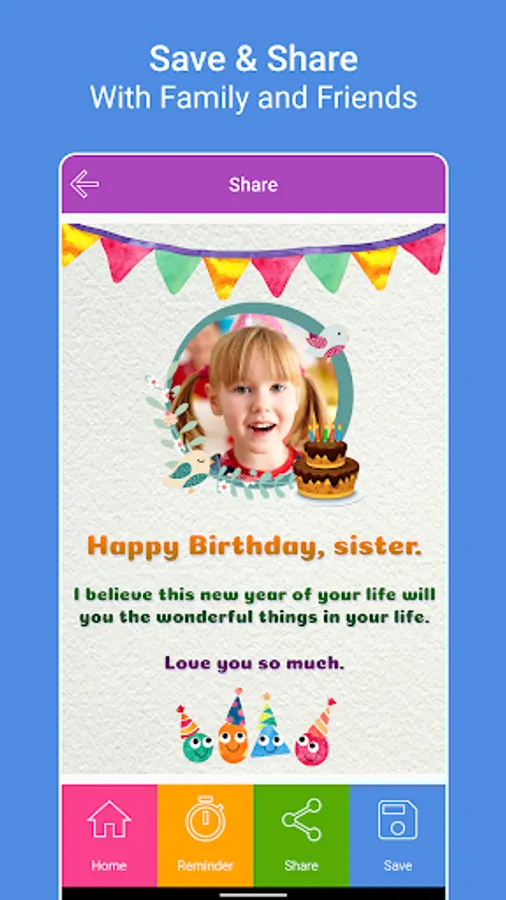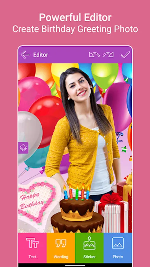 Insert your Friends and Family photos in beautiful Birthday photo frames, add text, stickers and Share them.