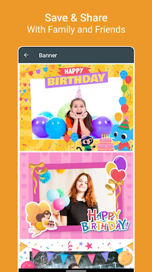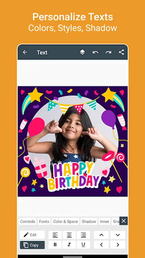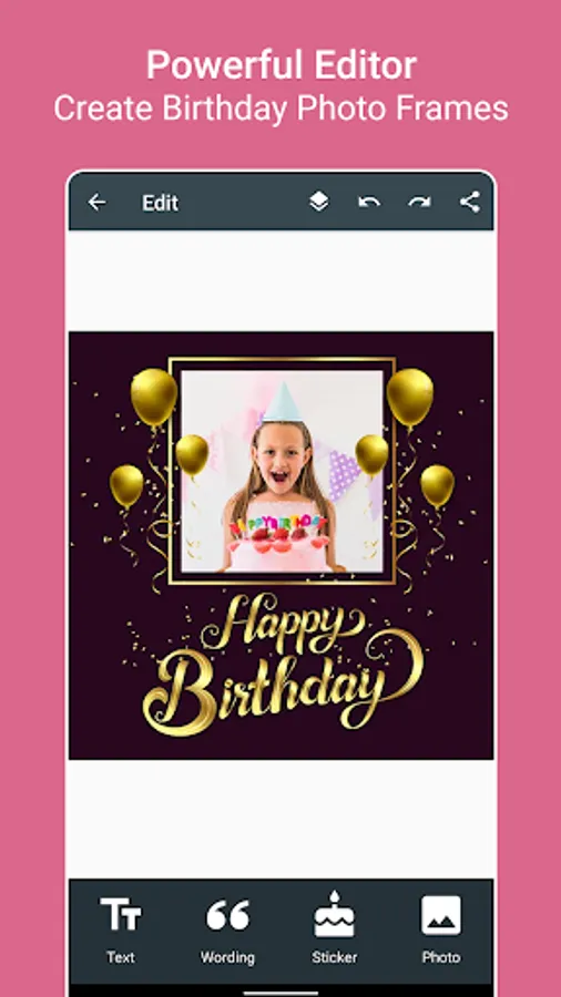 Wordings: Lot's of pre-defined wordings to put birthday greetings on photo by just single tap.