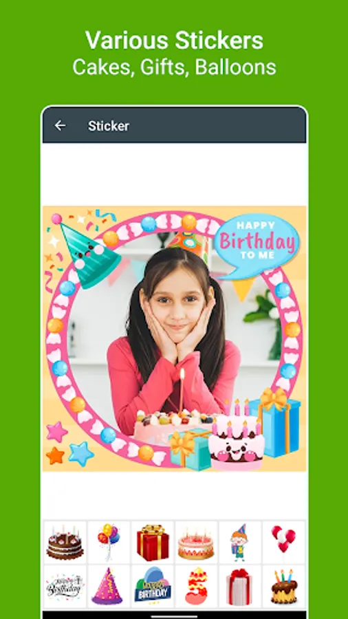 Stickers: Decorate your photo with various birthday stickers like hat, birthday cake, gifts etc.