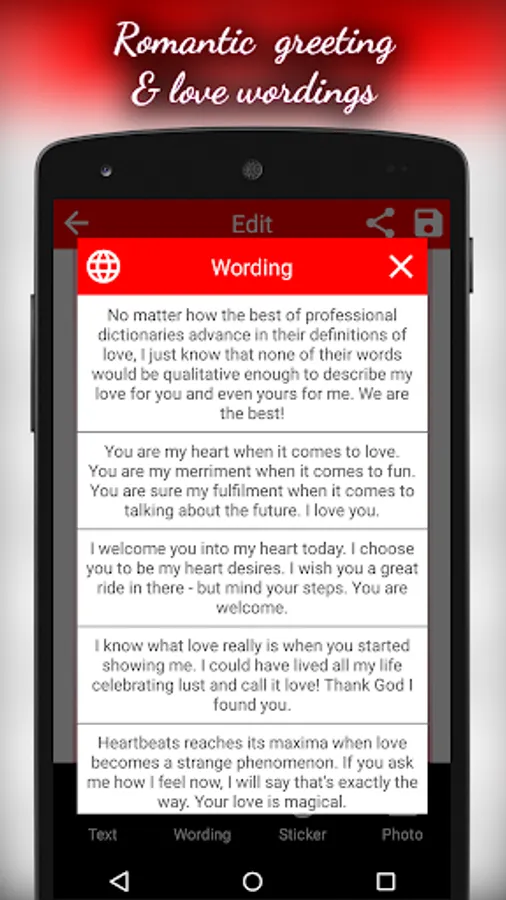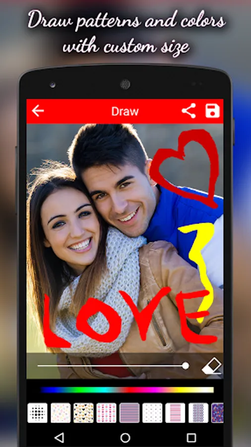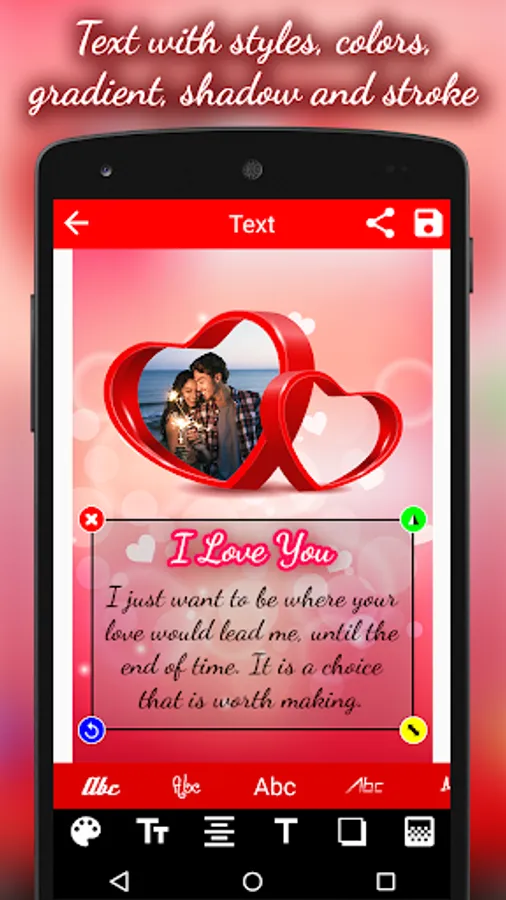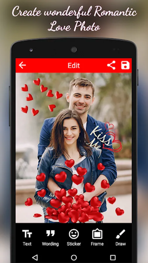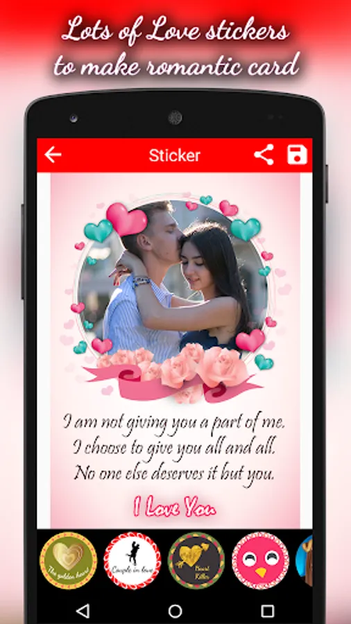 This is awesome way to say ‘I Love You’. This “Love Cards - Photo Frames” free Romantic Cards Maker offers you Love Cards, Romantic Quotes, frames, hearts, flowers, chocolates, hashtags, birda & various categories of stickers also you can draw Heart patterns and colors over on yours picture.