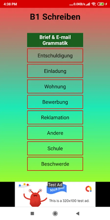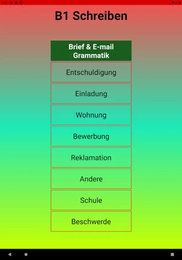 Diese App ist für Niveau B1 Deutsch Schreiben Prüfung. Die App hat verschiedene Themen und viele Briefe für lesen und üben.