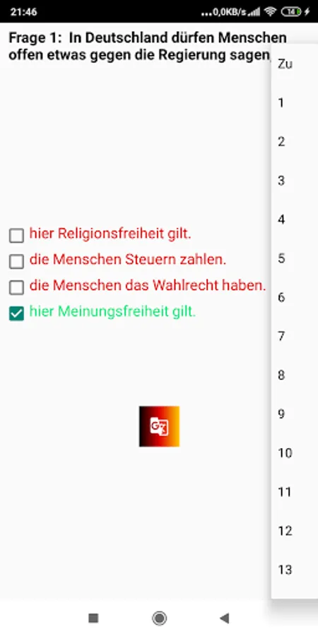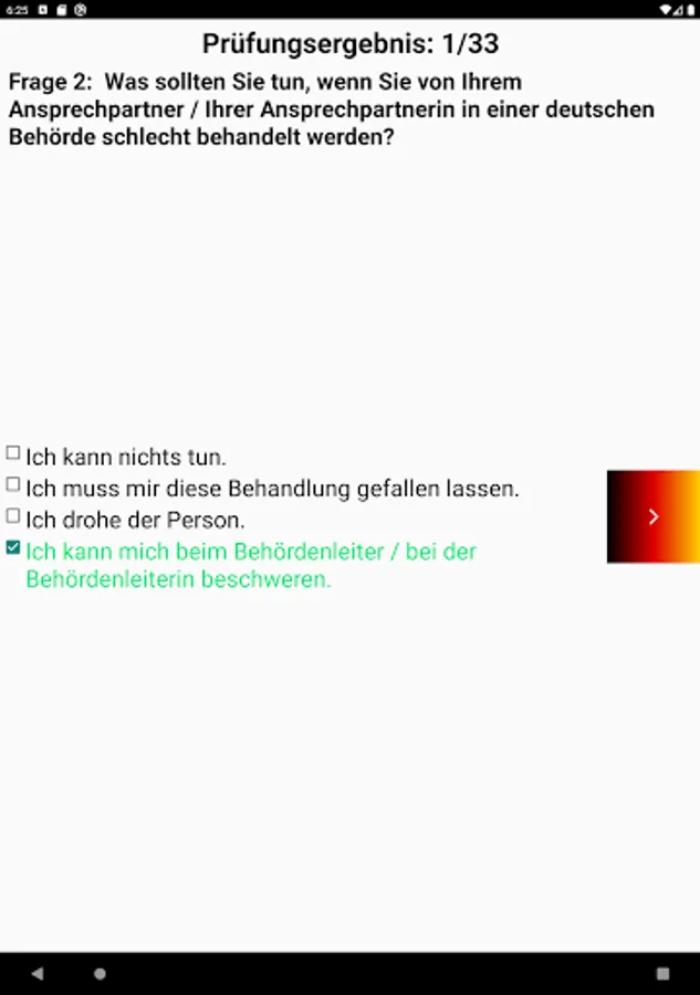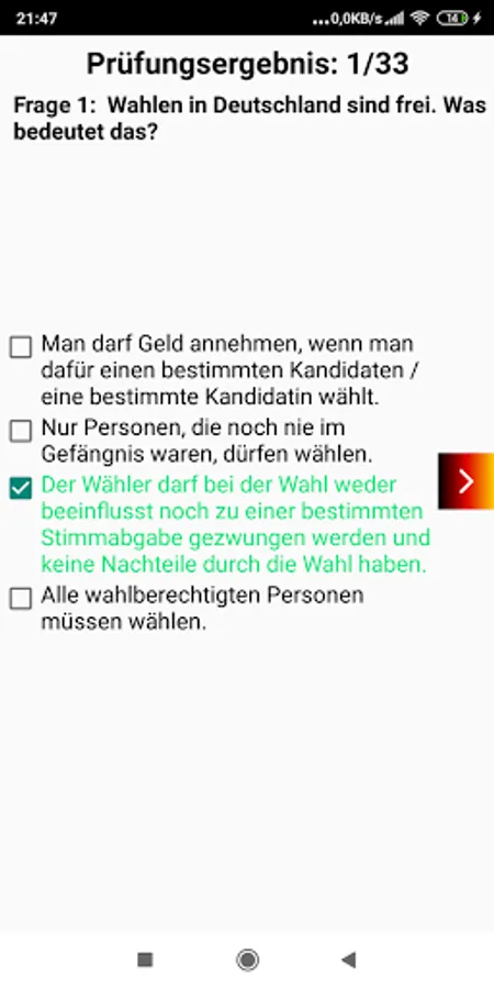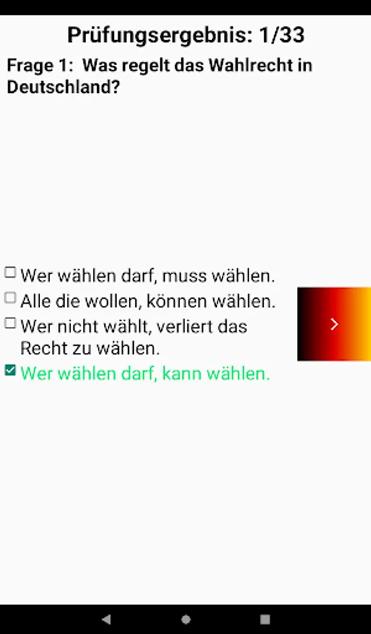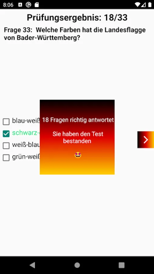 7. Sie haben viel geübt und möchten sich jetzt selbst testen. Klicken Sie auf dem Home Screen auf die Prüfung Button und machen Sie einen Test. Die Prüfung wird zufällig mit 33 Fragen im richtigen Verhältnis zu allgemeinen und Bundeslandfragen.