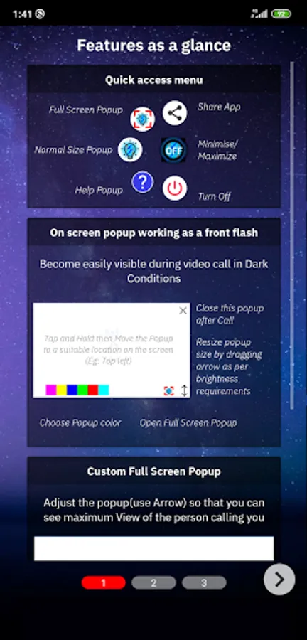 After opening a flash(On Screen Popup) Minimize this application, then open your video call application and enjoy the freedom of calling in the dark.