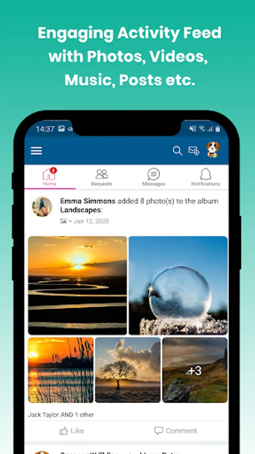 With rich features of SE Activity feed, users can share Photos, Videos, Music, Links via status box. Can also like, comment & share posts (internal & externally on other social media apps) & select network privacy for each post.