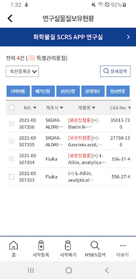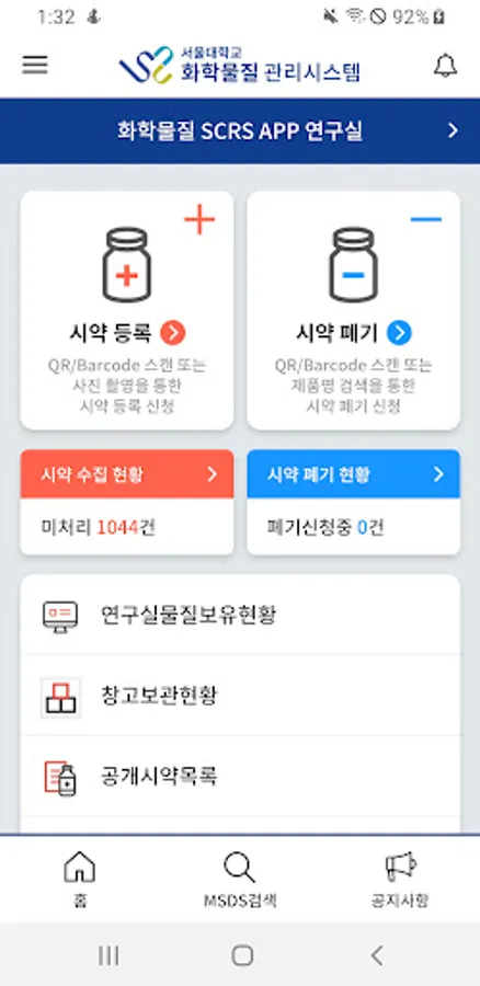 The Seoul National University Chemicals Management System (SCMS) APP is an app that provides services for researchers to easily and conveniently manage chemical substances (reagents) in the Research Plan Integrated Information System (SAFE), supervised by the Environmental Safety Agency of Seoul National University. Bar code and QR code It provides functions such as registration of chemical substances using code, registration using photo taking and photo upload, and material safety data sheet (MSDS) search.