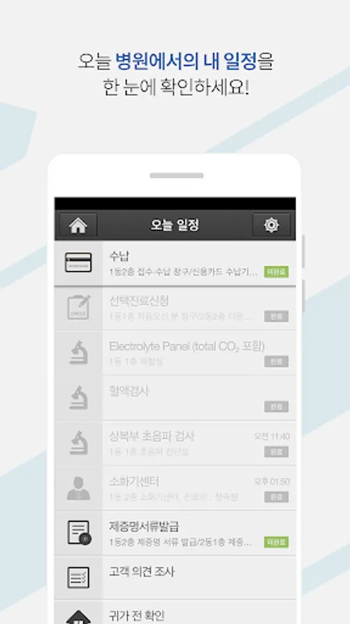 This service, which can be used as a smartphone app, provides real-time information on tasks to be performed at every step, such as overall reservation status, schedule and details of treatment and examination for the day, information on payment of medical expenses, surveys, and completion of the schedule.