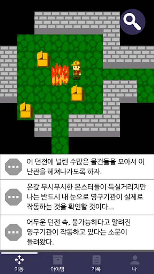 - 화면 우측 상단의 돋보기 모양 아이콘을 누르면 탐색모드로 전환되어 카메라 이동, 화면 확대 축소, 몬스터 정보 등을 볼 수 있습니다.