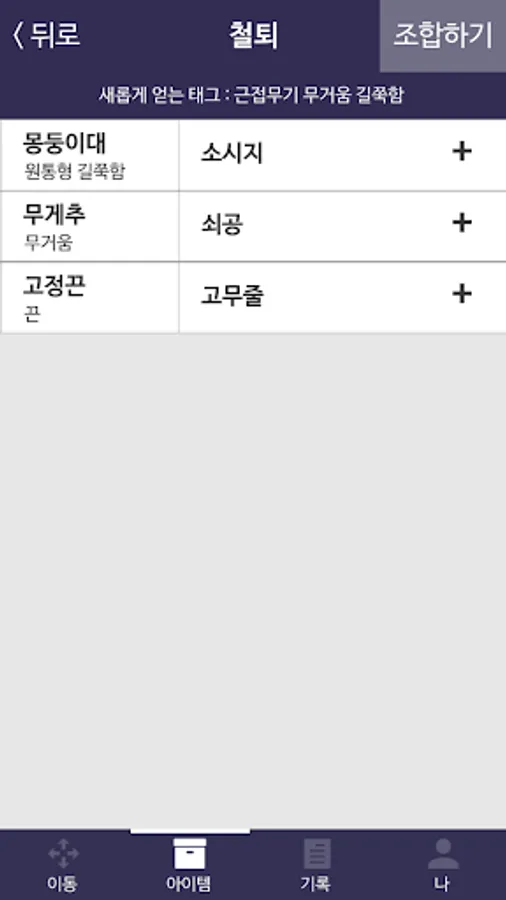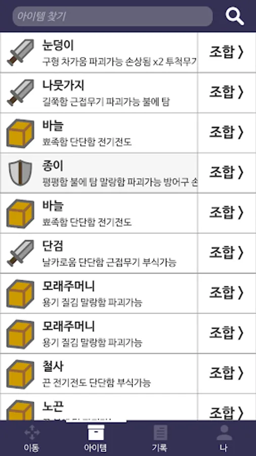 - 화면 하단의 메뉴에서 인벤토리, 캐릭터 정보 등을 볼 수 있으며 인벤토리 안에서 아이템을 선택해 조합할 수 있습니다.