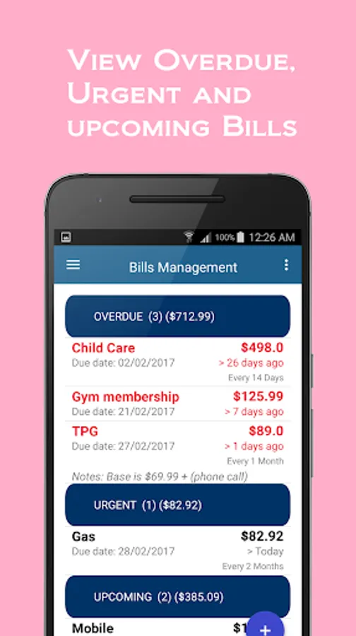 • Reminder to alert overdue, urgent and upcoming bills at your convenient time even when app is not running
