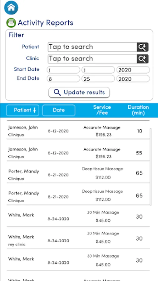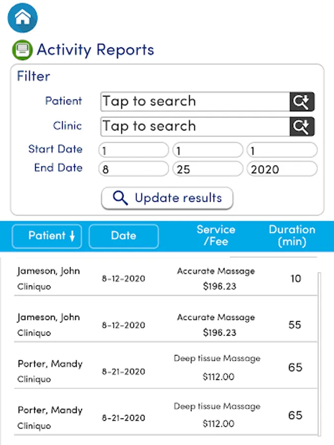 · Activity Reports - Ability to filter and sort by dates, clinic, types of service & more.