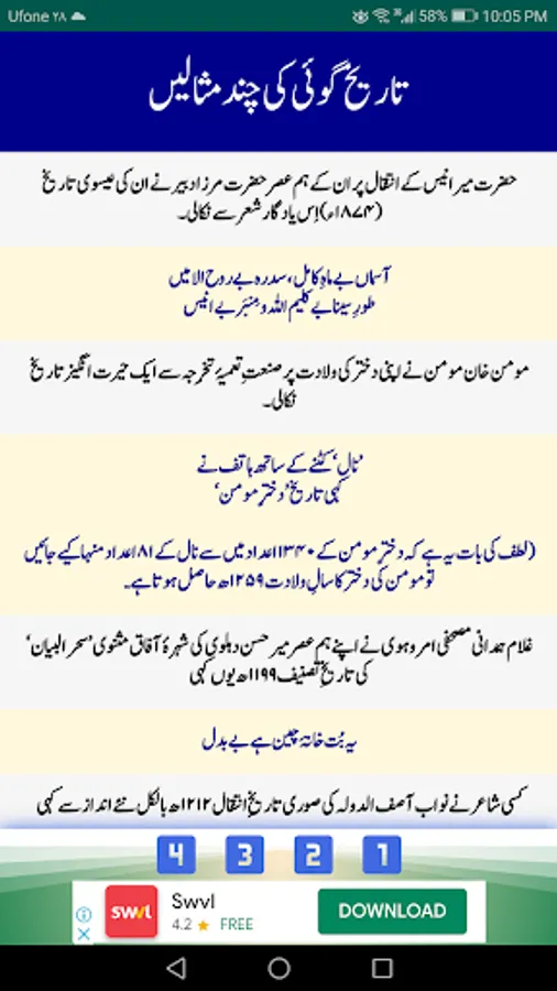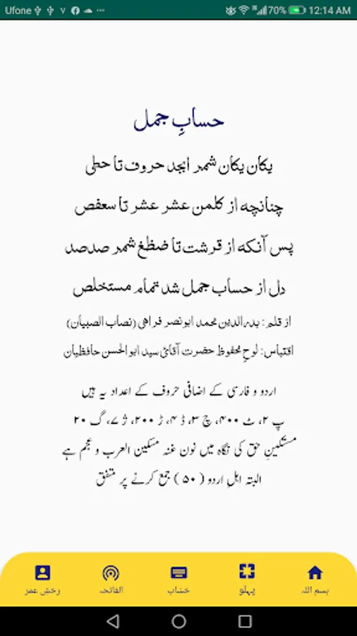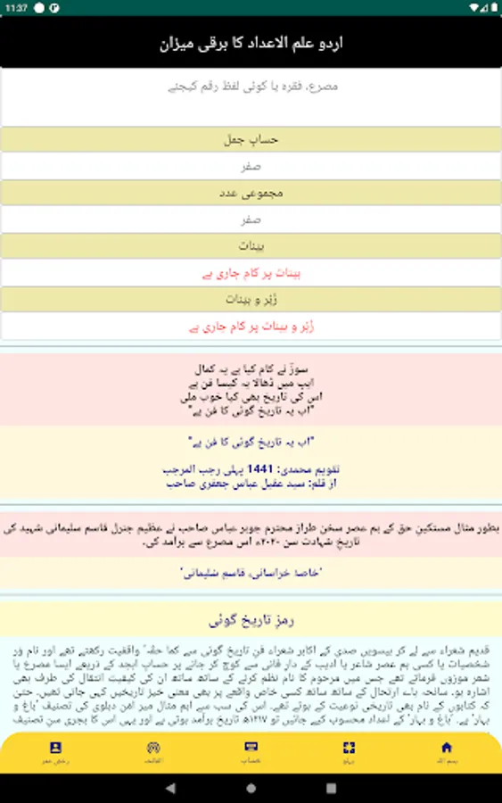 This application is developed by young Urdu Poet Soaz Sahib in order to calculate the numeric value(Aadaad-اعداد) of a phrase or sentence of Urdu language or a rhythmic line from Urdu poetry with the help of numerology (a.k.a. ILM-Al-ABJAD)