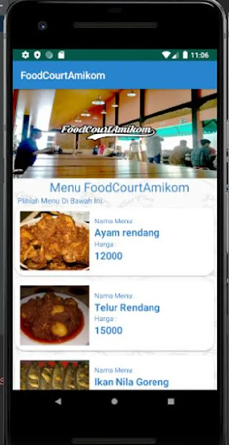 Amikom's FoodCourt application is made with the concept that consumers can choose food and drinks to order. Each time choosing a type of food, the Amikom FoodCourt application will show the picture so that consumers can find a picture of the food and drinks to be bought. Then consumers can also choose more than one type of food and drink and more than one type of item, food and drinks that will be ordered by consumers will be included in the purchase table list and then ultimately totaled.