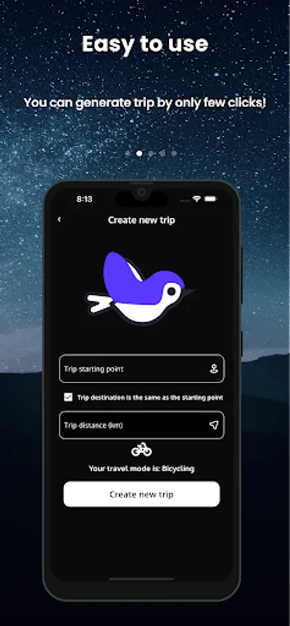 🚀 With Triply, you can easily generate trips tailored to your wanted distance. Simply choose your mode of transportation, enter your starting location and select your desired distance and if you want add the ending location!