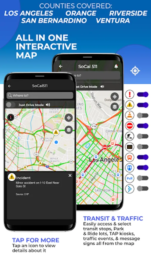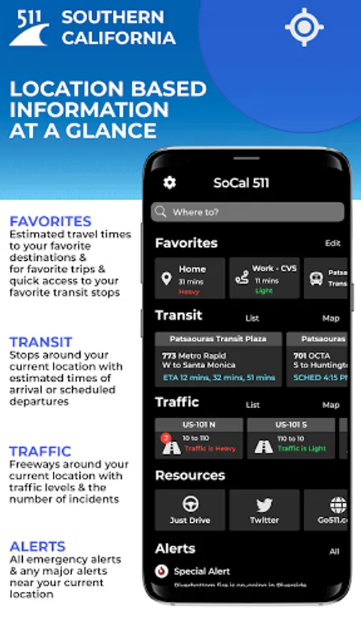 • Get alerts on emergencies and major events that may affect travel in the SoCal 511 region