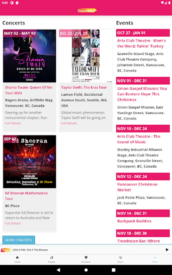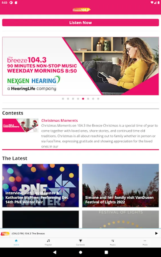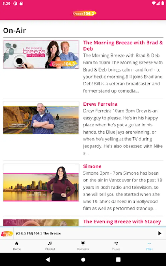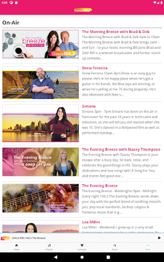 104.3 The Breeze Vancouver’s Home for Relaxing Favourites and is Vancouver’s “At Work Station”. A radio station that plays softer songs you know and love from the past 40 years and gives them a place to relax and recharge in today’s busy world.