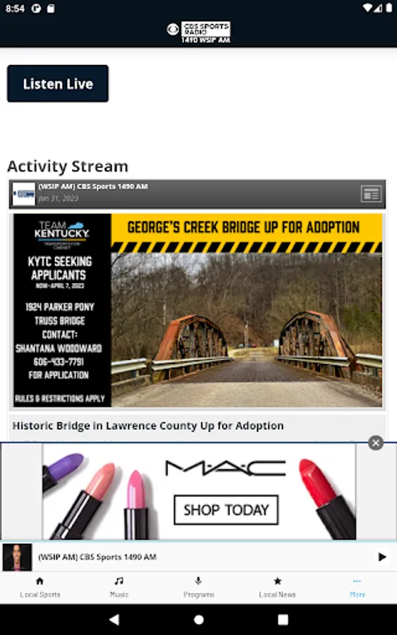 WSIP 1490 AM in Paintsville, Kentucky is a CBS Sports Radio affiliate. All the latest in national sports news can be heard 24/7 on WSIP 1490 AM. WSIP AM is also an official broadcast partner of the Motor Racing Network. Check out WSIP 1490 AM each day on air, online at wsipam.com, and via the mobile App. WSIP AM is a Forcht Broadcasting radio station.