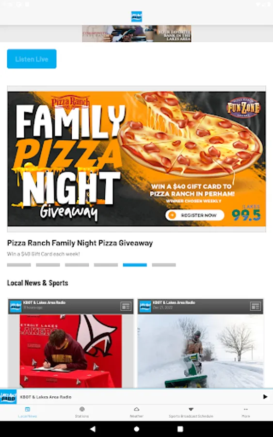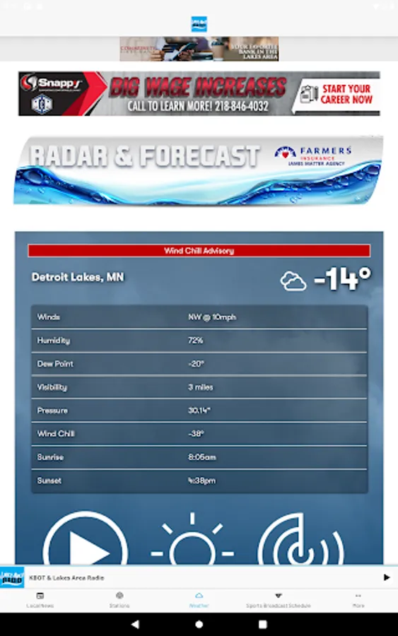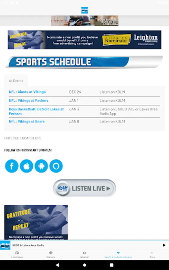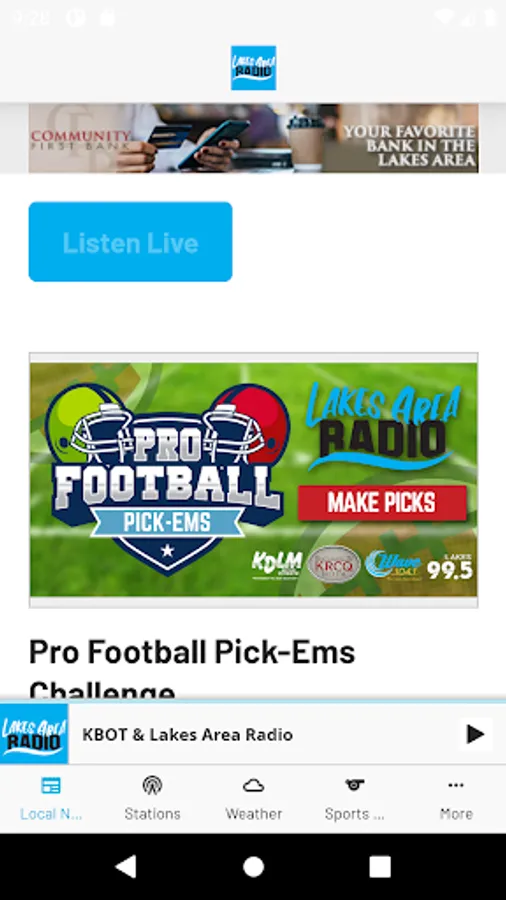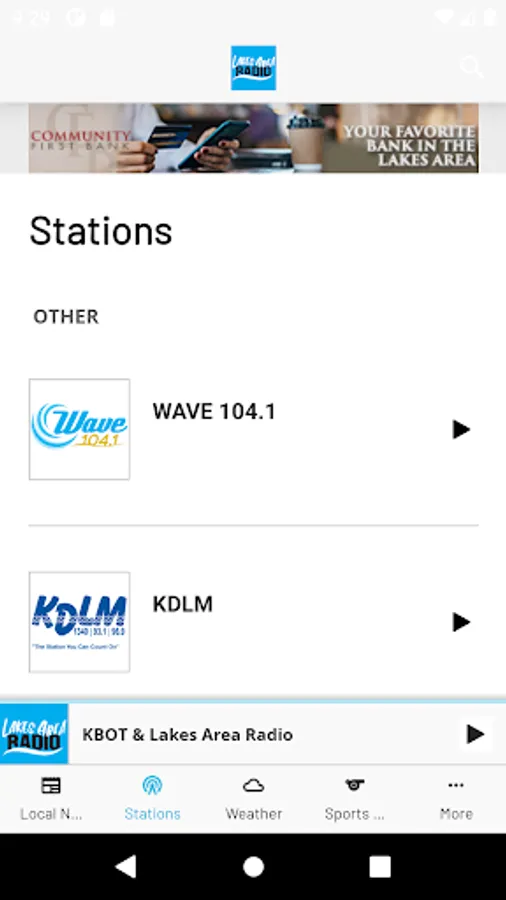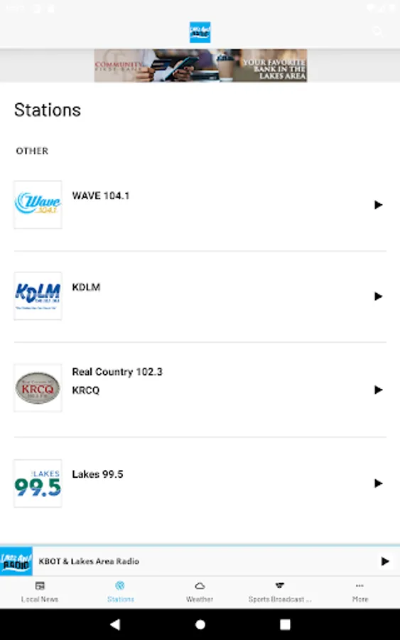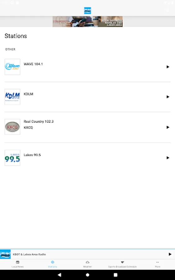 Listen to your favorite stations: KDLM, Real Country KRCQ 102.3, Wave 104.1 KBOT & Lakes 99.5 KPRW all in one spot. Stay up to date with latest local news, weather, sports and information in the Lakes Area. Enable push notifications and be the first to know about weather alerts and breaking news. Lakes Area Radio is your connection to the lakes community.