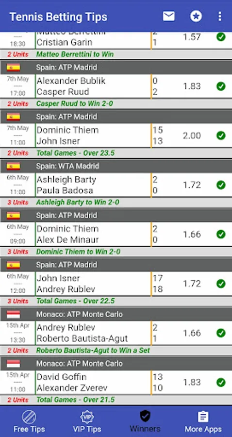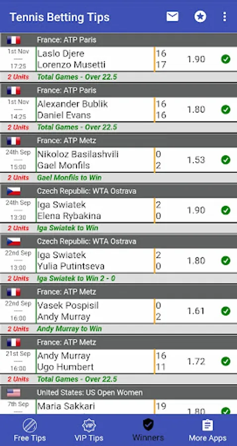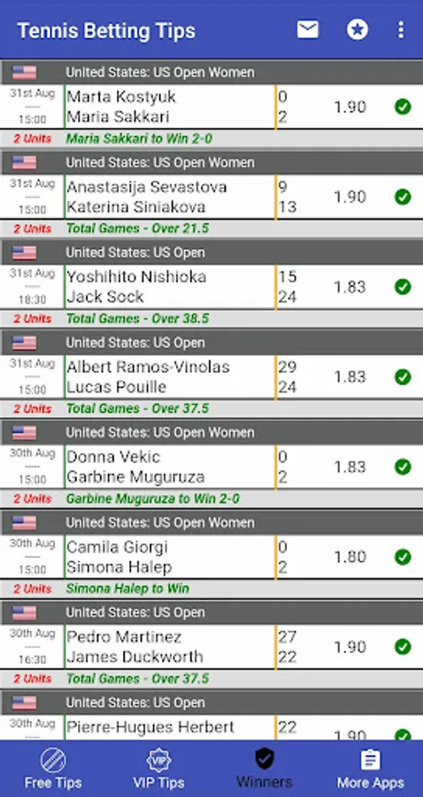 Our VIP Betting Tips - Tennis app gives you 2 to 4 free tips daily, VIP Tennis Betting tips are available in the VIP area, you can get instant access by paying a small fee with our subscription plans.