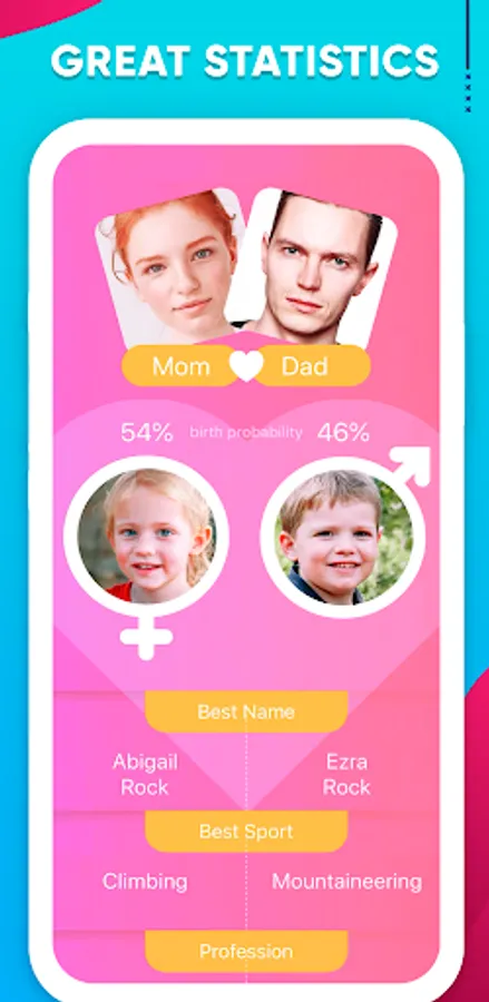 Do you want to know? Take a picture and discover the face of your future baby! Make a real prediction about your baby’s face. This app uses the technology of AI but does not use any genetic análisis techniques. Many facial features! Future Baby Face – Baby Maker is a fast analyzer based on dad and mom photos to make predictions.