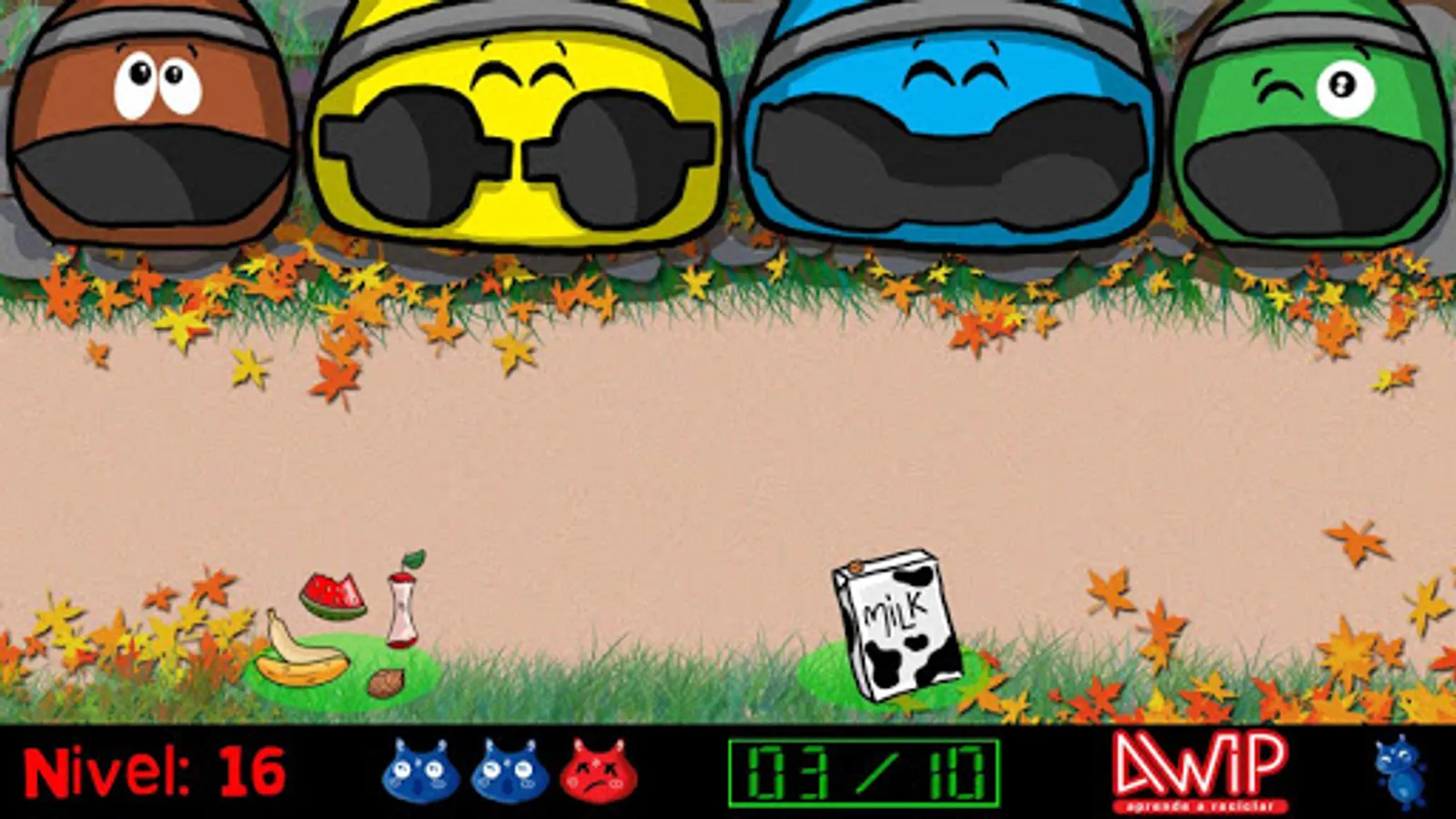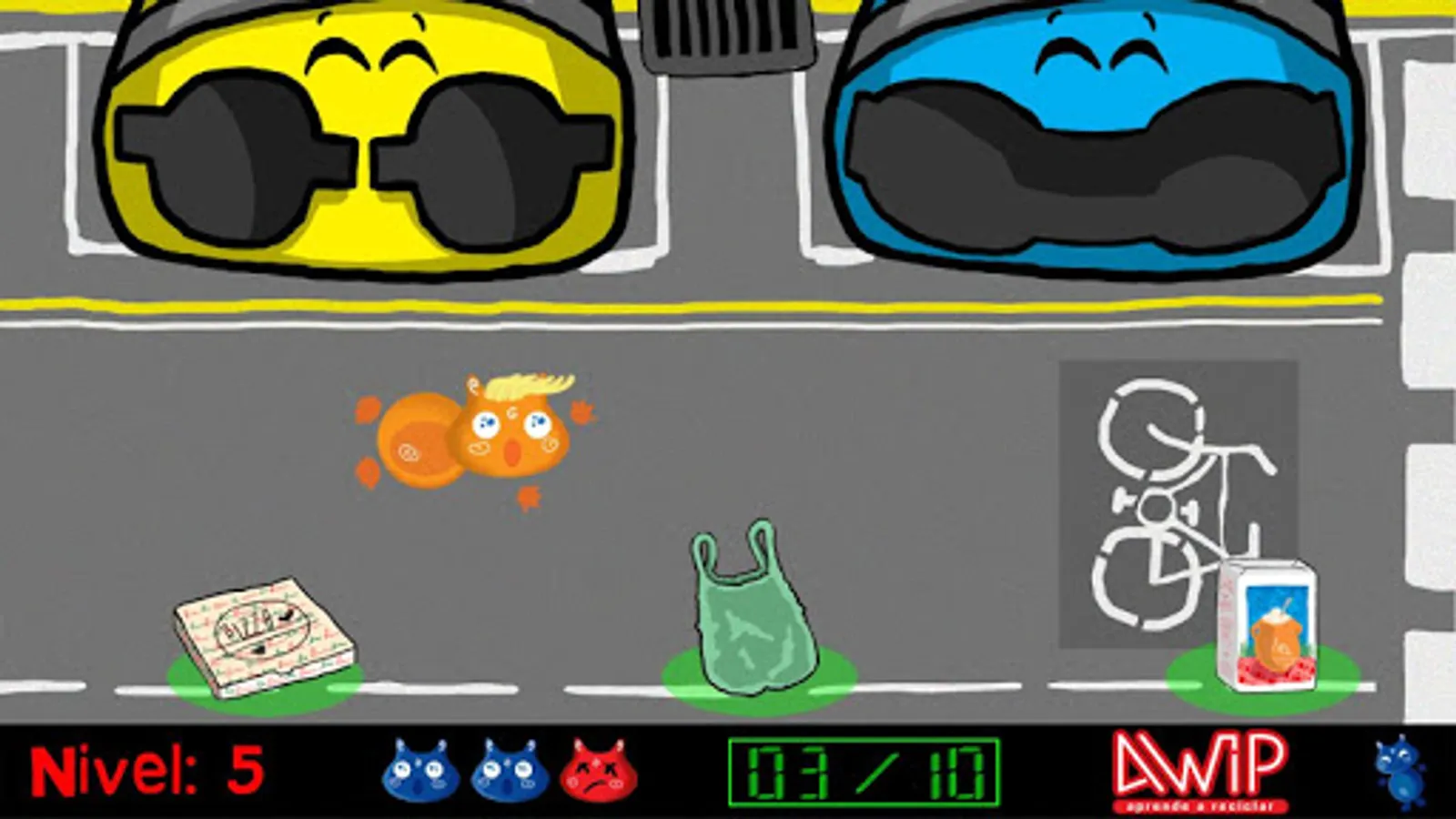 The alien Awip has come from a distant galaxy to visit our planet. She is very curious to know how we recycle and she wants you to teach her how to recycle. What container does a banana skin go to? And a bottle of water? And a diary? Throw away every waste in the corresponding container and keep in mind that the enemy of Awip will not make it easy for you !!