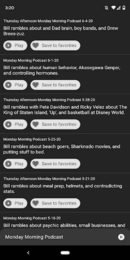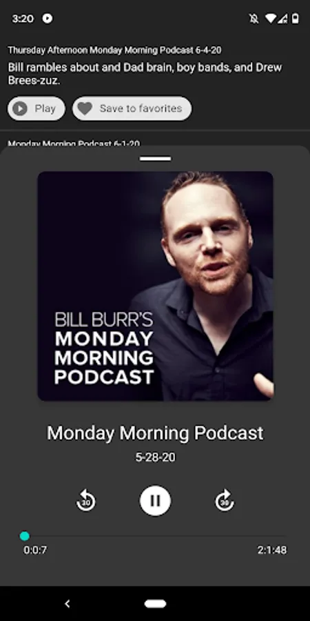 This is a media player application that allows the playing of the 25 most recent episodes of comedian Bill Burr's Monday Morning Podcast. It uses a foreground service and media style notification to keep playing audio when using other apps or when the device goes to sleep.