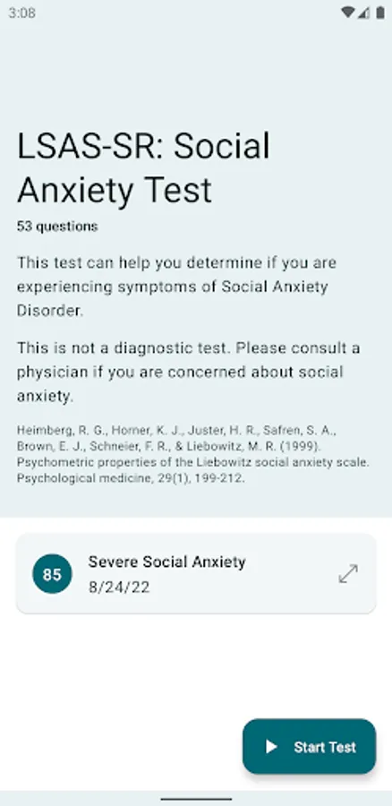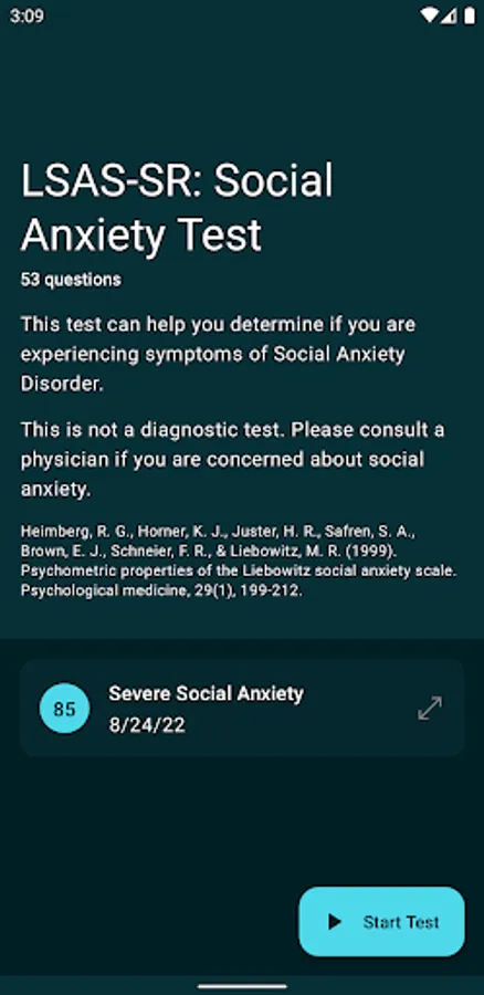 This app presents the Liebowitz Social Anxiety Scale, a validated screening questionnaire that aims to measure the severity of Social Anxiety Disorder (SAD), also known as Social Phobia. The LSAS-SR is a 24 question self-rating scale which covers fear, avoidance, and physical signs of social anxiety.
