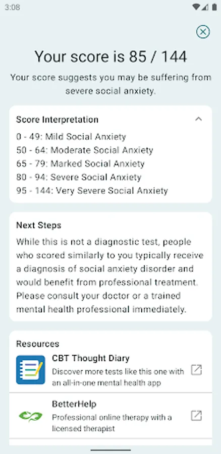 Disclaimer: This questionnaire cannot indicate a diagnosis of social anxiety disorder. Only a qualified professional can make this diagnosis. Please consult a physician if you are concerned about social anxiety disorder.