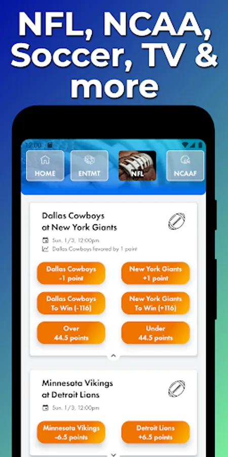 1️⃣ Browse live Vegas odds and make a prediction (ex. 49ers +3 points at Rams)