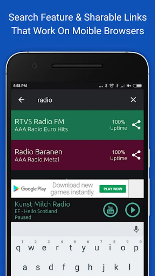 Introducing the best AAA Music Radio Stations App with live up-to the minute radio station streams from around the world. This app has 500+ of the top "Always Live" radio stations arranged by the station’s uptime percentage so you always get a "Live Radio Feed". We have also integrated a 1-Click YouTube search feature that lets you watch videos of any song that is playing on live radio. AAA Radio app also shows you information about what song is currently playing on any particular radio stream & allows you to share radio station links with your friends and family that will work on any mobile browser without having to download our App. AAA Radio App also allows you to search any radio stations by name. We have worked very hard to build this beautiful Radio App with all the best design practices which will provide you with the best user experience & hours of entertainment.
