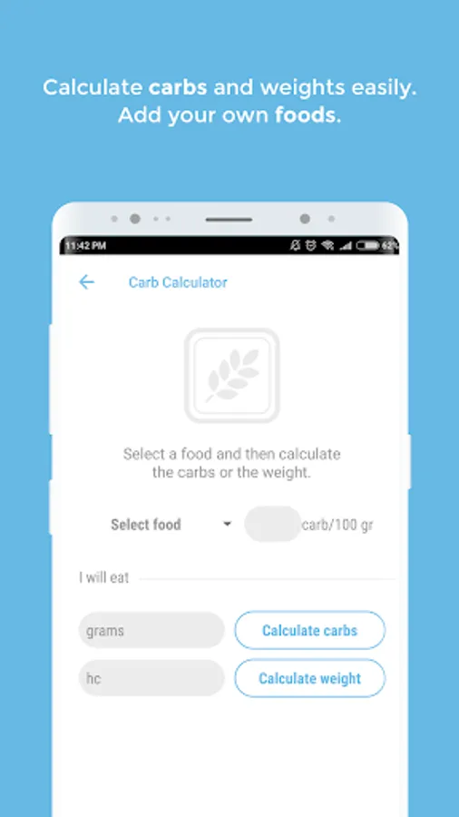 -Carb Calculator: from the nutritional database, select each food and calculate the number of carbs that you are going to eat, by grams or rations.