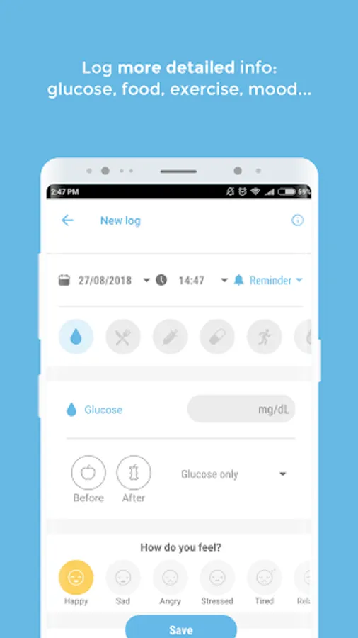 Type 1 and Type 2 diabetes care requires a lot of tracking. With SocialDiabetes, register all the relevant information to your treatment such as blood glucose levels, insulin, carbs, medicaments or physical activity.