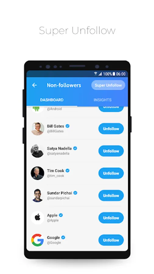 Use the Super Unfollow button to unfollow up to 1000 users in one click.